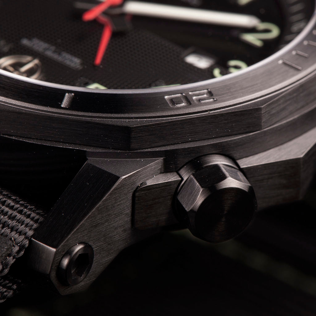 The solid stainless steel, brass dial combined with super luminous hands gives the Hypertec H-61 a stunning look at all hours of the day. This Swiss movement watch incorporates a date window nestled into the brass dial and a 24-hour GMT indicator. Its unidirectional outer bezel and dual directional inner bezel can be used for tracking capabilities. The solid stainless steel 42mm case and sapphire crystal glass are strong enough to work underwater, up to 330 feet/100 meters, with no hassle.