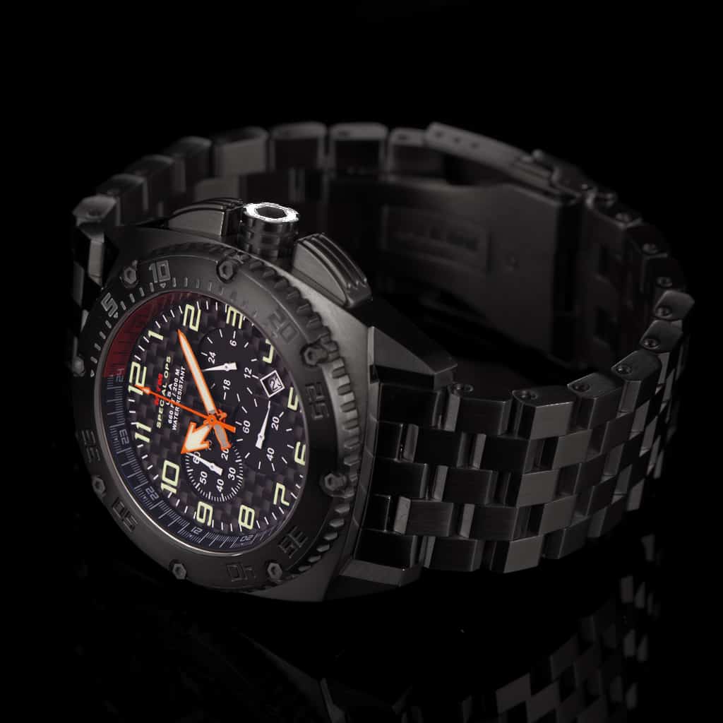 The MTM Black Patriot chronograph watch is a tactical and durable military timepiece with a NASA-grade carbon fiber dial, sub-dials and a solid 316L stainless steel case (Also available in titanium). Properly protected with a locking screw down crown to ensure a water resistance depth of 660 feet. As one of the best military watches for men, the MTM Black Patriot is a classic and favorite for active duty military, veterans, police officers and firefighters. This durable and dynamic watch represents the strength of all Patriots and their freedom.