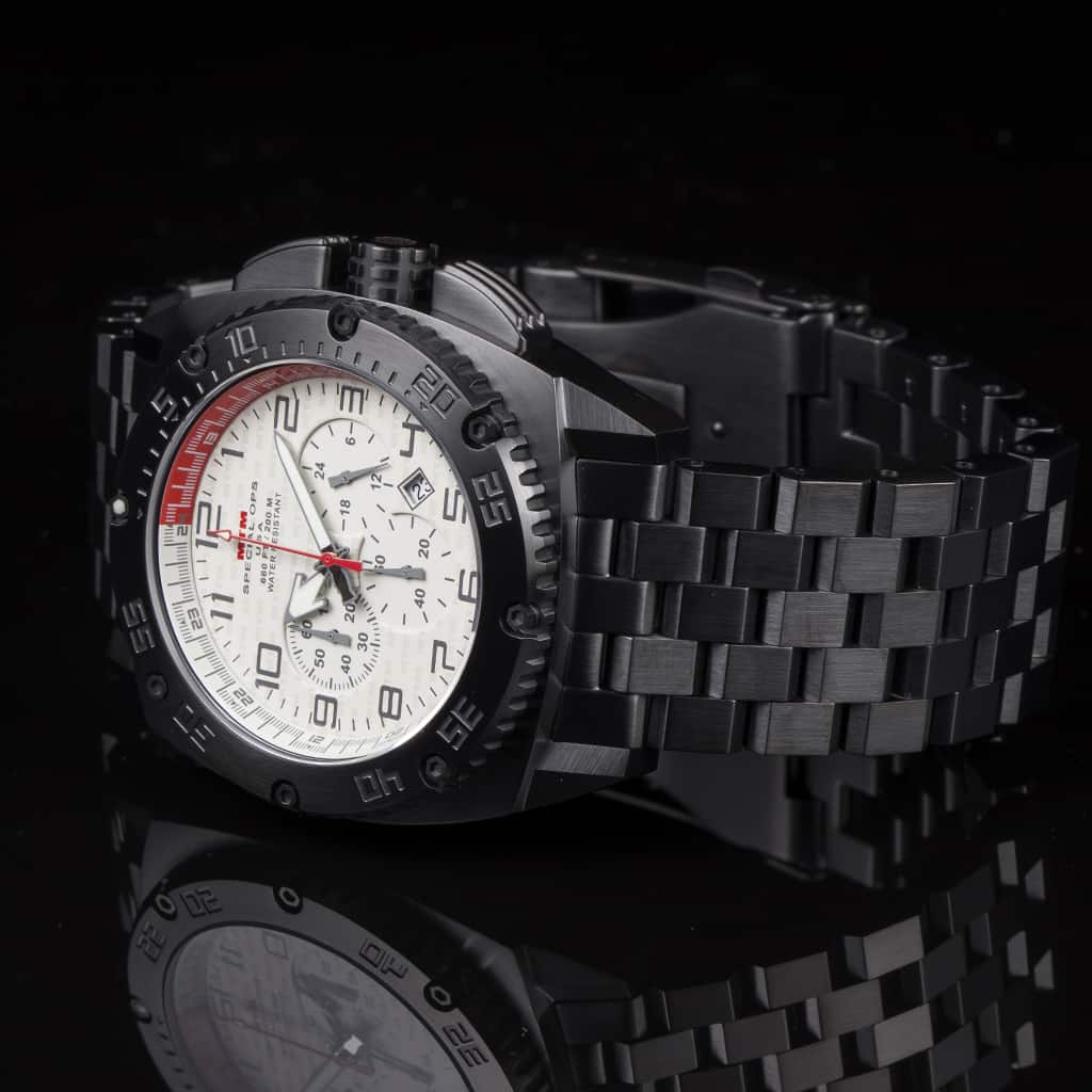 The MTM Black Patriot chronograph watch is a tactical and durable military timepiece with a tan brass dial, sub-dials and a solid titanium case (Also available in 316L stainless steel). Properly protected with a locking screw down crown to ensure a water resistance depth of 660 feet. As one of the best military watches for men, the MTM Black Patriot is a classic and favorite for active duty military, veterans, police officers and firefighters. This durable and dynamic watch represents the strength of all Patriots and their freedom.