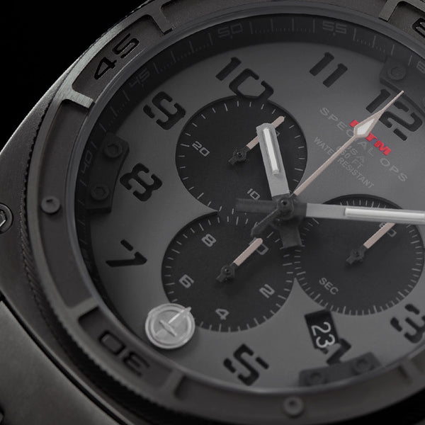 MTM Special Ops Black Predator II watch can withstand service under the most extreme conditions. Its three dial chronograph measures down to one tenth of a second, which is illuminated with tritium glowing hands. A solid titanium watch case ensures its strength and resilience for years of use. The locking screw-down crown protects it from water damage to help its depth protection of up to 200 meters/660 feet.