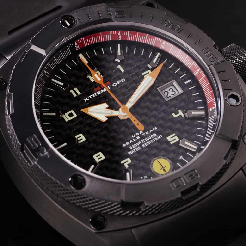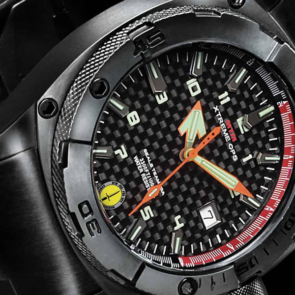 The MTM Black SEAL is one of our most specialized wristwatches made for the Special Ops line. Used widely by highly-trained divers and special operations/forces units worldwide, the MTM SEAL can perform up to 3,300 feet/1000 meters underwater. This is made possible by its locking screw-down crown, solid titanium case, and automatic helium release pressure valve. Another key feature of this watch is its tritium gas-tube filled hands, which glow without the need of an external light source. The Swiss quartz movement in this diving watch has been calibrated for precise and accurate timing.