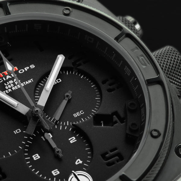 MTM Special Ops Grey Predator II watch can withstand service under the most extreme conditions. Its three dial chronograph measures down to one tenth of a second, which is illuminated with tritium glowing hands. A titanium watch case and/or band ensures its strength and resilience for years of use. The locking screw-down crown and buttons protects it from water damage to help its depth protection of up to 200 meters/660 feet.