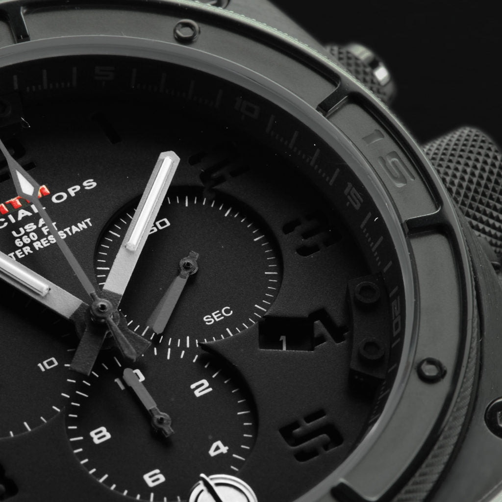 MTM Special Ops Grey Predator II watch can withstand service under the most extreme conditions. Its three dial chronograph measures down to one tenth of a second, which is illuminated with tritium glowing hands. A titanium watch case ensures its strength and resilience for years of use. The locking screw-down crown and buttons protects it from water damage to help its depth protection of up to 200 meters/660 feet.