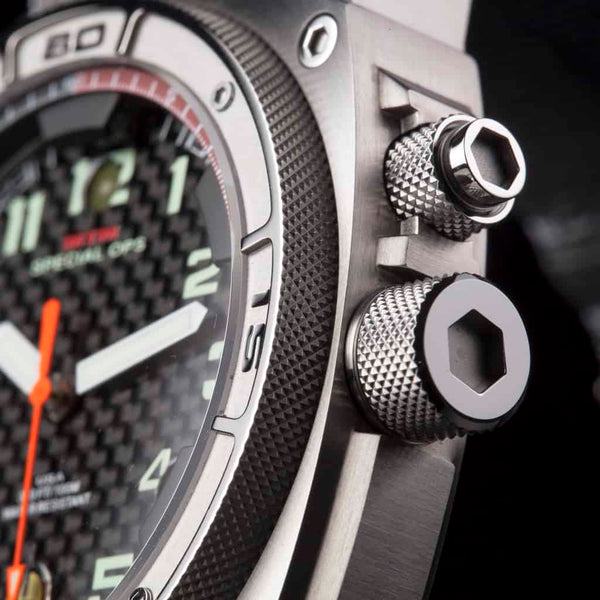 watch built for high-performance missions and extreme durability. Engineered with military and law enforcement professionals in mind, this cutting-edge timepiece delivers mission-readiness in a rugged, no-nonsense design. Constructed from ultra-durable 316L stainless steel or in its lightweight titanium version, the Falcon is battle-tested and field-proven. Its tough, tactical exterior houses a hybrid analog-digital movement, powered by a rechargeable lithium-ion battery.
