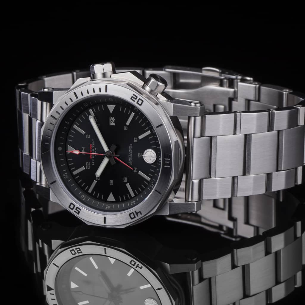 The dial combined with super luminous hands gives the Silver Hypertec H-61 a stunning look at all hours of the day. This Swiss movement watch incorporates a date window nestled into the brass dial and a 24-hour GMT indicator. Its unidirectional outer bezel and dual directional inner bezel can be used for tracking capabilities. The solid stainless steel 42mm case and sapphire crystal glass are strong enough to work underwater, up to 330 feet/100 meters, with no hassle.