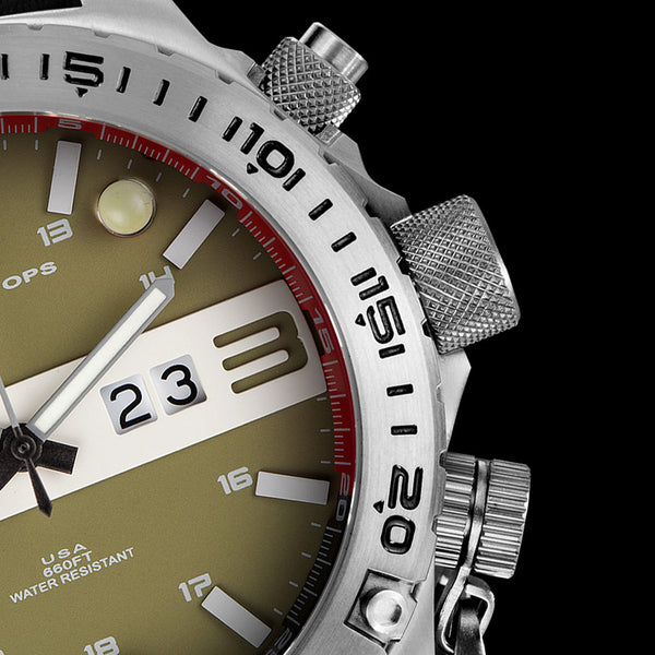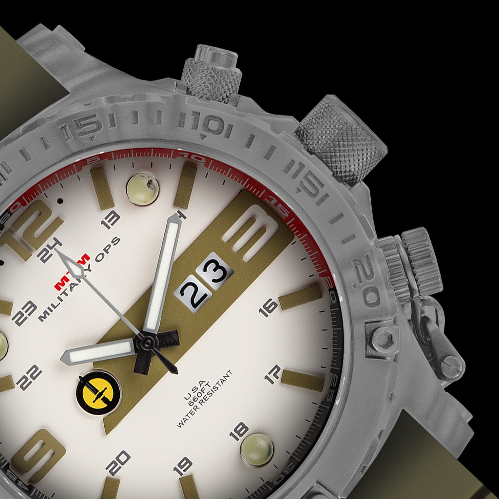 The MTM Vulture is a military tactical watch created for the most extreme and strenuous conditions. Its lightweight case, constructed of solid titanium, fits comfortably on your wrist, while the scratch-resistant sapphire glass offers full dial protection. Underwater, this men’s watch will perform up to depths up to 660 feet/200 meters without any issue.